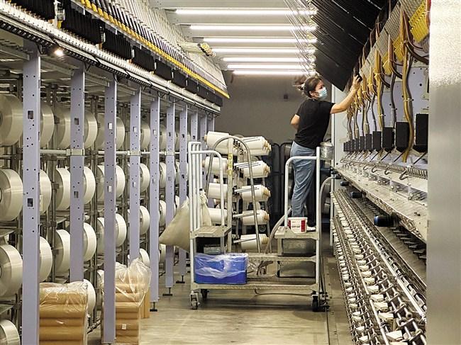(在广东坚达聚纤科技实业有限公司,工人在锦纶加弹机上作业。)