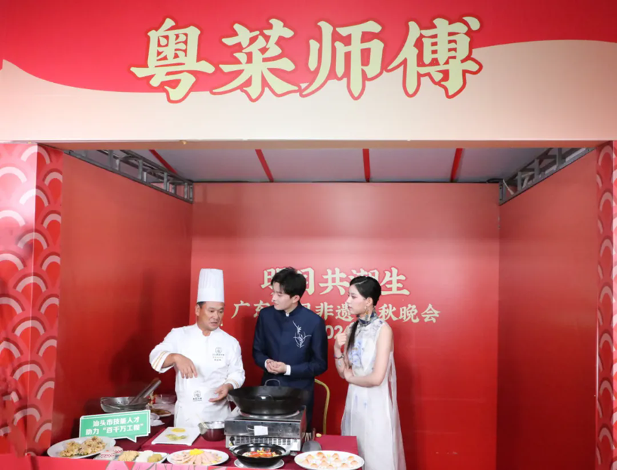 菊花蟹、菊花鱼、菊花糕点、菊花虾丸……在“明月共潮生”2024广东卫视非遗中秋晚会的舞台现场,来自汕头技师学院的南粤技术能手、五星级“粤菜师傅”名厨郑创坤“玩转”东湖特产菊花,即兴烹饪出数十道“潮”味佳肴,令主持人和现场观众食指大动、眼前一亮。