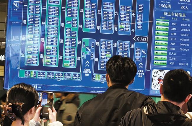 网约车数智化调度系统还能实时监测现场车流、人流情况。管理方可根据系统显示的拥堵情况及时采取相应措施,网约车平台也可接收实时数据,及时推送车辆停靠车位并根据需要增调车辆。此外,网约车区出入口增设了智能道闸,系统与行业主管部门数据对接并实时更新。合规网约车驶至道闸即可自动识别放行,非合规车辆则无法进入该区域。
