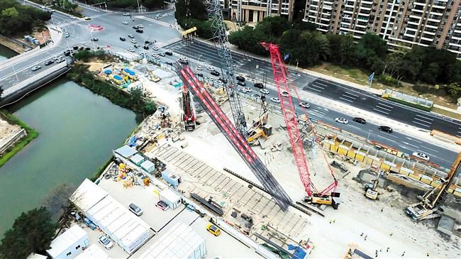 龙湖附中站位于中山东路南侧、黄厝围沟西侧绿化带内,紧贴中山东路东西向布置。车站为地下三层侧式车站,长150.6米,标准段宽29米,采用明挖法施工,基坑最大开挖深度超过35米。车站围护体系采用厚1.2米的地下连续墙结合内支撑形式,墙体深达46米至56米,结构稳固,为后续深基坑作业打下了坚实基础。
