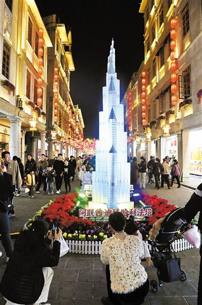 夜幕之下,小公园街区花灯依次亮起,中山纪念亭化身一盏巨大的走马宫灯,展示汕头商埠文化和产业历史的梦幻光影在百年骑楼前徐徐展开。大小、形态各异的主题花灯“龙”重登场,五座五彩盘龙抱柱灯组及主题灯墙,融入大量“龙”元素及潮汕文化、华侨文化,全方位展示汕头侨乡风采。游人如织、热闹喧嚣的小公园片区流光溢彩,璀璨花灯与游人相映,呈现出一幅幅独具潮汕特色的欢乐夜游图。