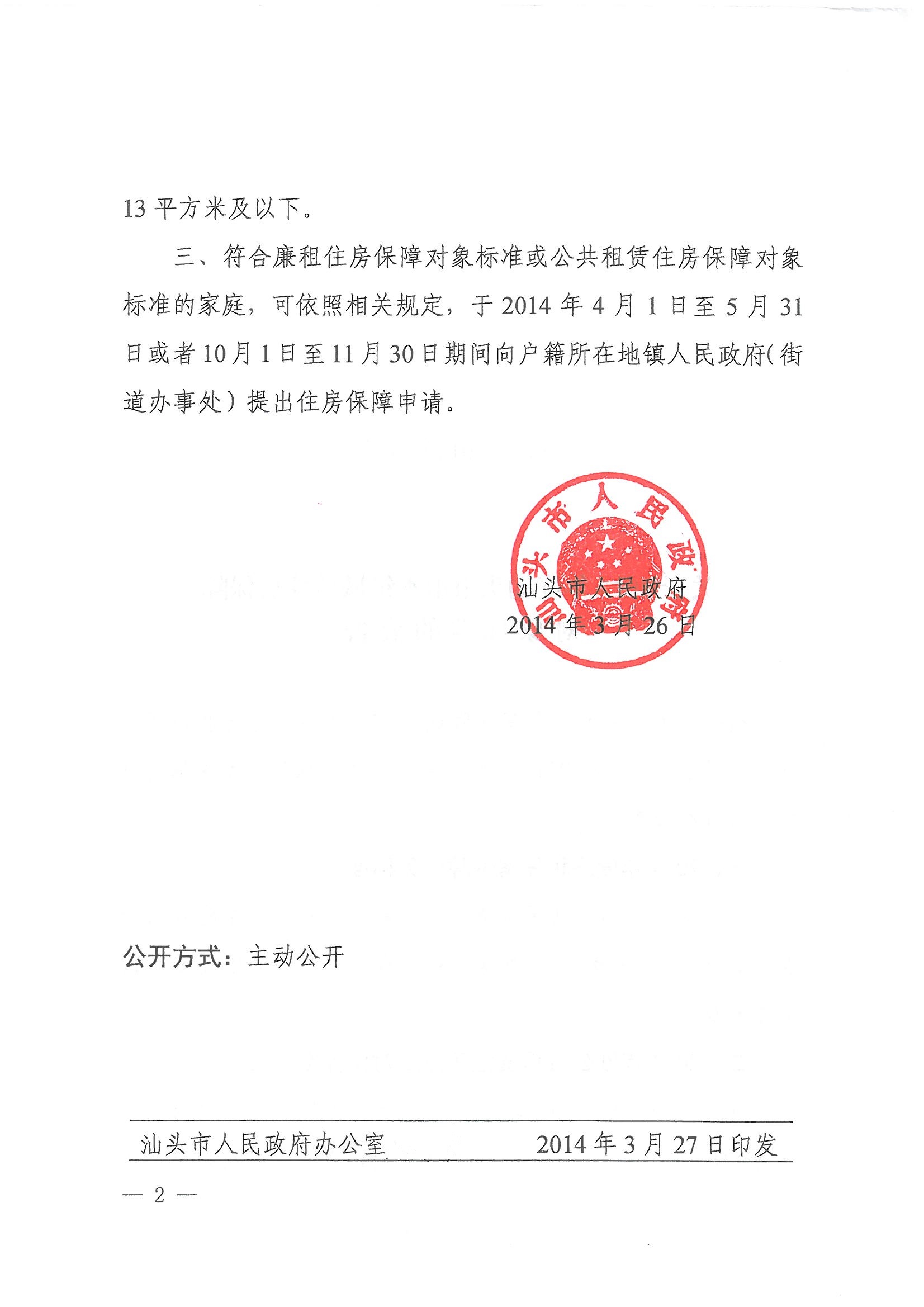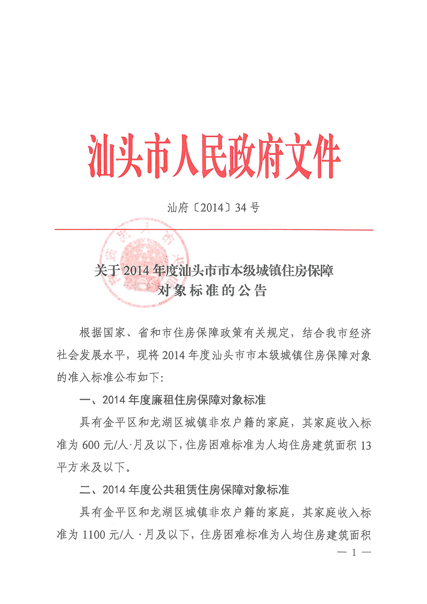 关于2014年度汕头市市本级城镇住房保障对象标准的公告