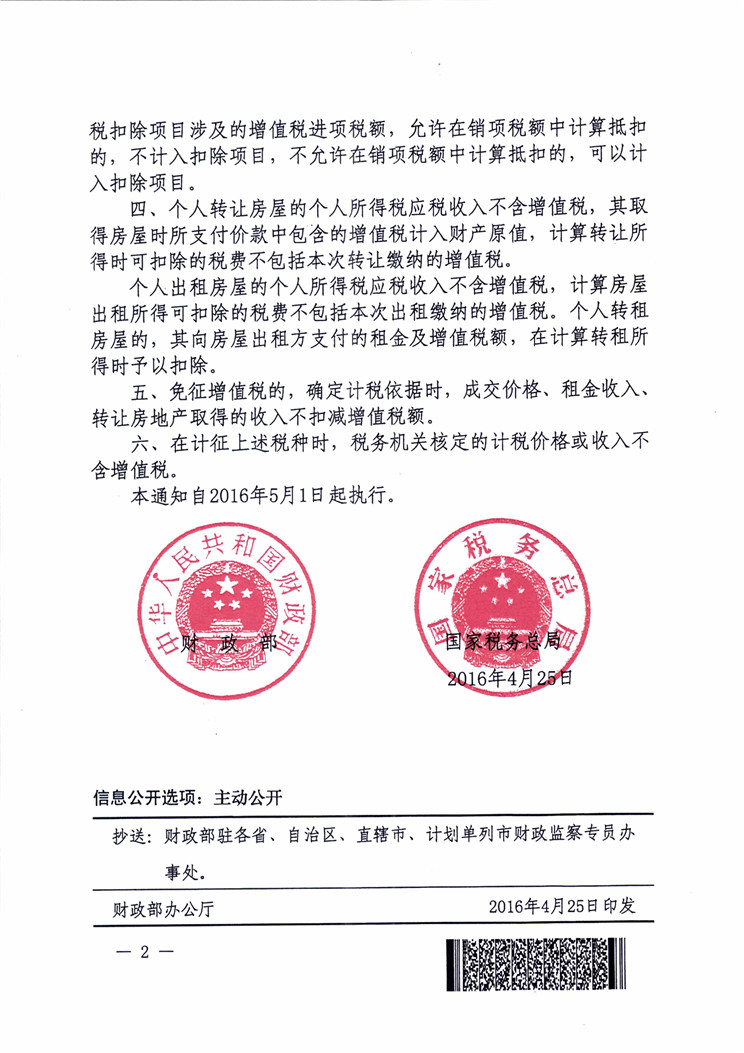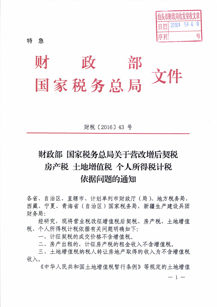 财政部 国家税务总局关于营改增后契税 房产税 土地增值税 个人所得税计税依据问题的通知