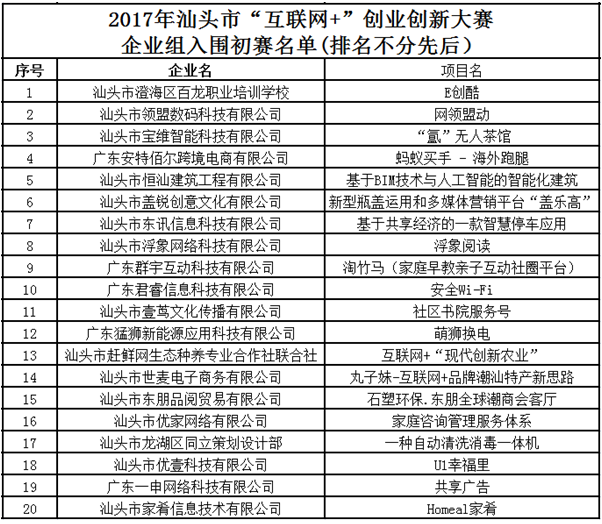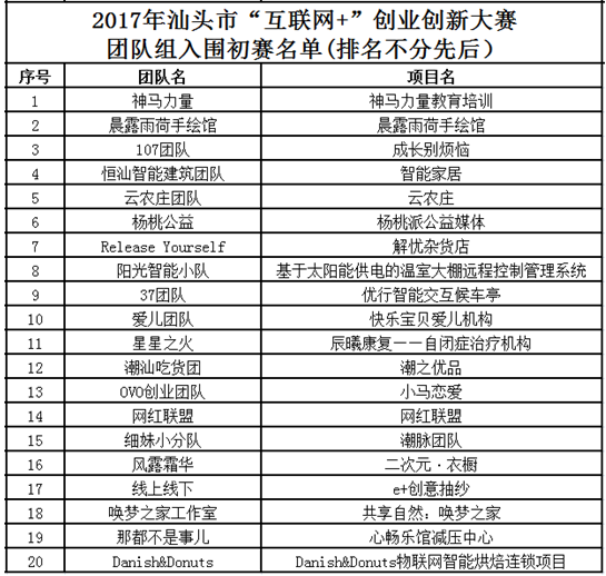 2.2017年汕头市“互联网+”创业创新大赛团队组入围初赛名单