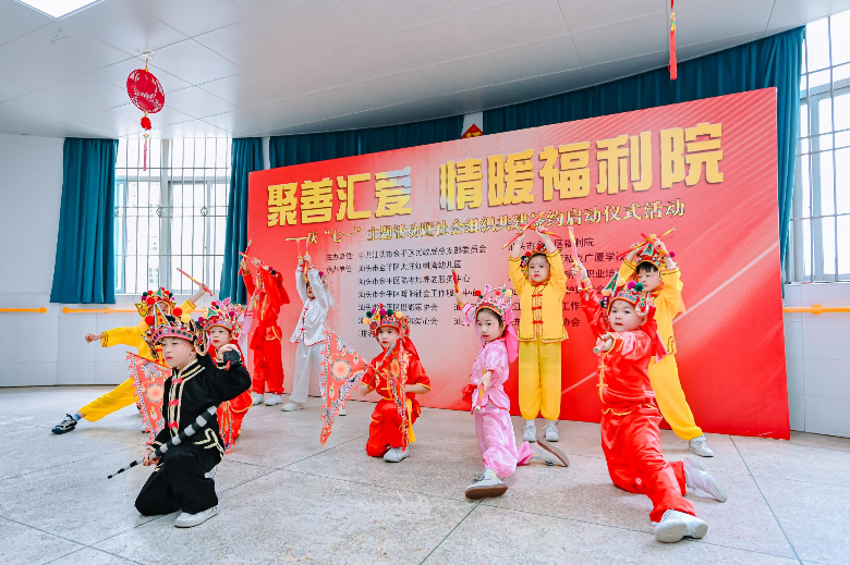 仪式上,金平区大洋红树湾幼儿园为老人们带来《中国人中国字》《我和祖国最亲亲》和《少儿英歌》等节目,幼儿园精心准备的节目表演让老人感受到浓浓暖意,整个福利院充满着温馨欢乐的氛围。