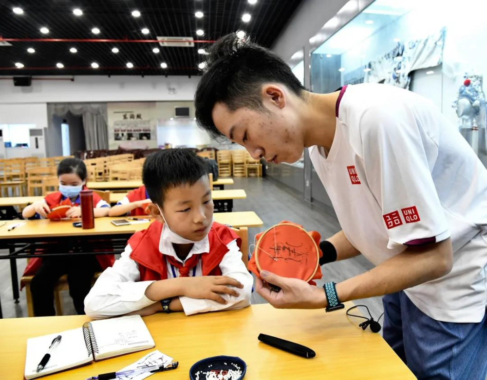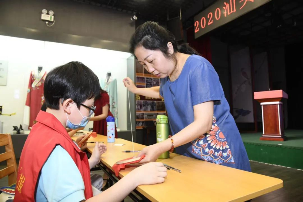 ▲珠绣课堂上,孩子们在非遗传承人的指导下,穿珠走线,动作逐渐娴熟。