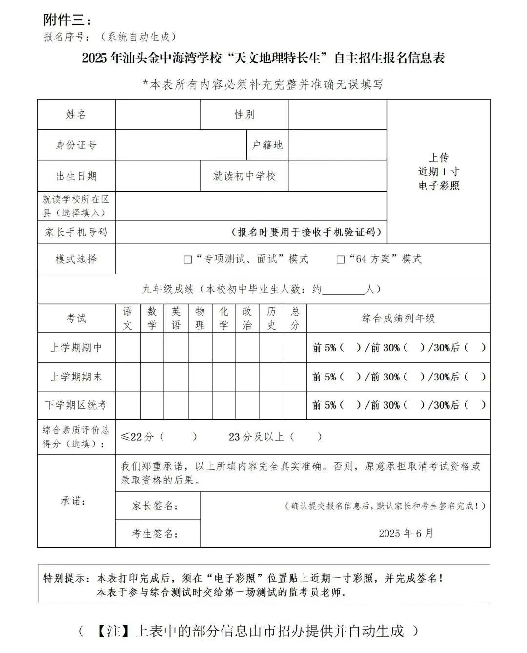 符合条件的2025届初中应届毕业生可自行于2025年5月18日~6月15日登录汕头金中海湾学校网站(www.stjzhwxx.net),点击进入“汕头金中海湾学校自主招生综合测试信息系统”,按页面提示如实、补充完整、准确录入有关信息【见附件三表模】。如有弄虚作假行为,考生将被取消综合测试资格或取消综合测试成绩,举报电话0754-81883966。