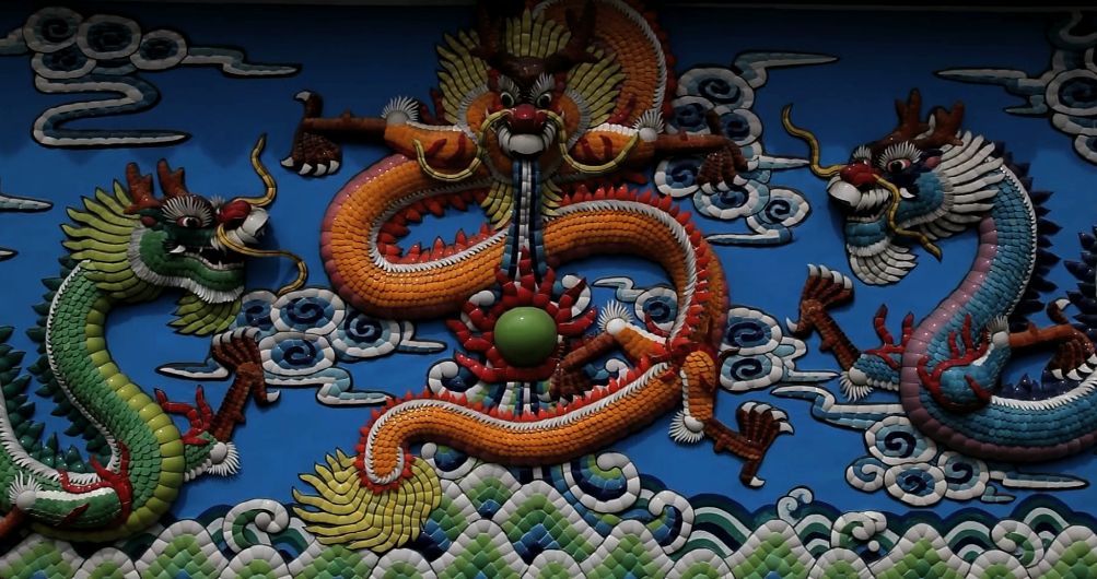 在大寮嵌瓷工艺社外,记者远远看到屋脊上的“九龙吐珠”嵌瓷作品,色彩绚烂的瓷片构筑出一条条雄劲矫健的飞龙,长约30米,以立体直观的形象盘旋在屋顶,姿态万千,对比强烈的彩色瓷片富有光泽,在夏日耀眼的阳光下熠熠生辉。