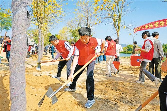 初春的鮀城惠风和畅、草木萌新。植树现场一片热火朝天,市领导和干部职工、部队官兵、学生代表及青年代表分工协作,一同扶正树苗、挥锹培土、踏土夯苗、围堰浇水,合力种下一株株黄花风铃木。新栽的苗木在春风中舒展嫩枝新芽,与练江碧水相映成趣,勾勒出一幅生机盎然的和美画卷。
