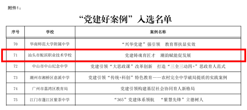近日,省委教育工委公布了“党建好案例、书记好党课、党员好榜样”优秀成果入选结果,市委教育工委、市鮀滨职业技术学校党委报送的《党建铸魂育匠才 潮韵赋能促发展》案例,成功入选省级“党建好案例”。
