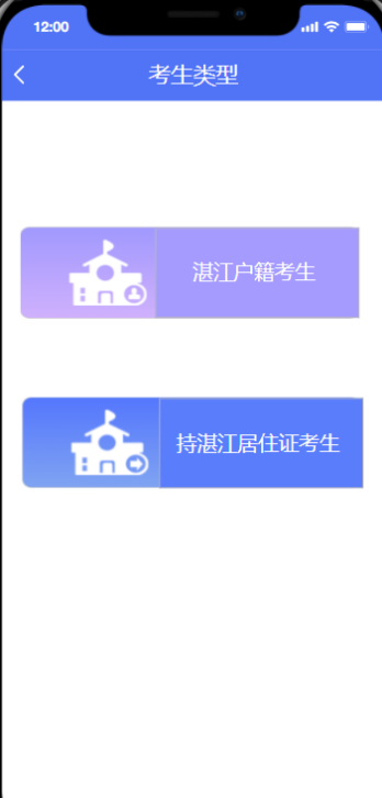 点击选择一种考生类型,“在校生”或“非在校生”,随后根据户籍类型,选择“户籍考生/居住证考生”进入学信网学籍/学历验证码校验。
