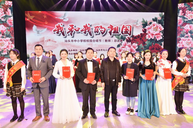 经过现场专家评委的认真评审,汕头市金山中学、金阳小学等6个单位荣获合唱节(教师)总决赛学校团队特等奖;汕头市澄海教工合唱团等2个单位荣获合唱节(教师)总决赛区县联合团队特等奖;吴博等6位老师荣获合唱节(教师)总决赛优秀指挥奖;陈乔等4位老师荣获合唱节(教师)总决赛最佳钢琴伴奏奖。汕头市教育局胡冬局长等领导为获奖单位和个人进行颁奖。“我和我的祖国,一刻也不能分割。无论我走到哪里,都流出一首赞歌……”伴随着《我和我的祖国》热情洋溢的全场高歌,活动圆满结束。