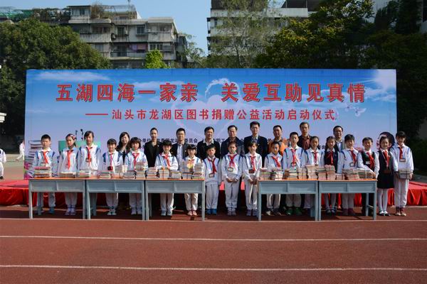 启动仪式在庄严的升国旗仪式和雄壮的国歌声中开始。主持人介绍出席活动的领导和嘉宾后,龙湖区委常委、政法委书记林少武和丹霞小学校长林耀强先后致辞,重点指出活动的目的意义,感谢社会各界对外来工子弟读书的支持,对外来工子弟代表寄予殷殷厚望。随后,丹霞小学学生代表上台捐赠图书,共捐赠书籍、图册近4000册;志愿者代表上台接收图书。502班学生代表赵思琪同学在讲话中代表受赠学生,对党和政府重视外来工子弟阅读、推动动全民阅读的举措致以谢意……龙湖区图书捐赠公益活动启动在简朴而又热烈的气氛中结束。