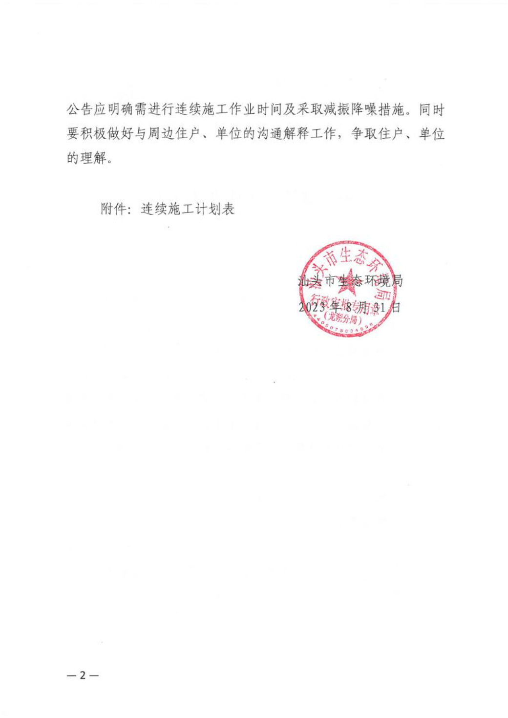 准予连续施工作业决定书(汕环龙湖施审【2023】35号)