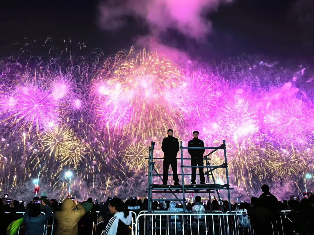 20时整,焰火晚会如约而至,欢呼声此起彼伏。而此时此刻,在每一个观演区域的边缘,在人流交汇的节点,民警们背对璀璨,面向人海,他们无暇仰望天空,却是观众眼中最有安全感的“背景板”。“看到警察就在身边,心里安全感满满。”一位抱着孩子观赏焰火的母亲感慨道。