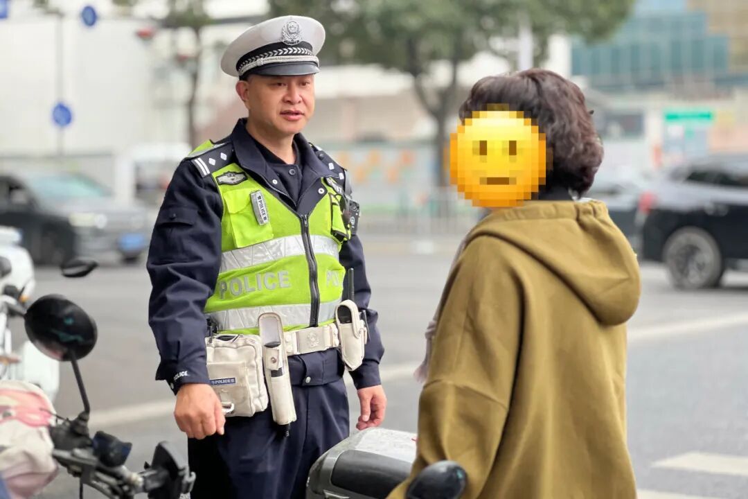 执勤交警向多名未依规上路的电动车骑行者普及安全教育。