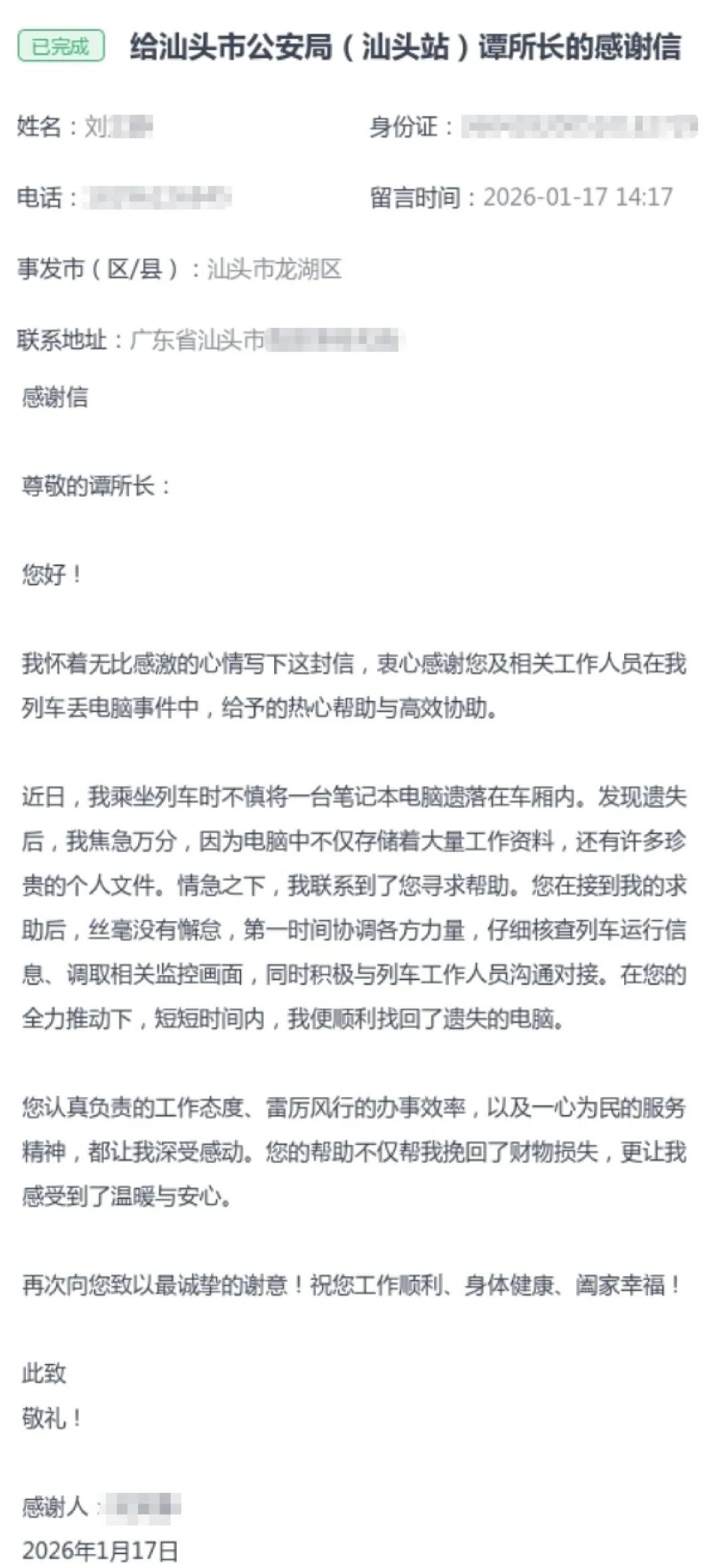 从手足无措到如释重负,刘女士对民警的帮助再三表示感谢。这份高效与热忱,让她感动不已。事后,她特意向汕头公安局长信箱寄信,信中写道:“您的帮助不仅帮我挽回了财物损失,更让我感受到了温暖与安心。”记录下的不只是失而复得的喜悦,更是一段警民之间以心换心的温暖篇章。