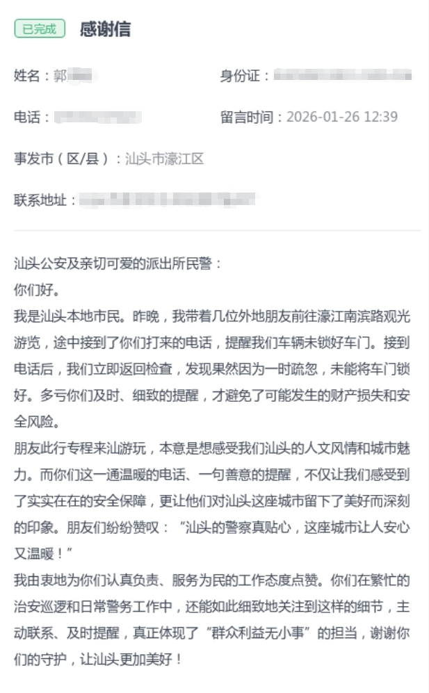 “你们这一通温暖的电话、一句善意的提醒,不仅让我们感受到了实实在在的安全保障,更让他们对汕头这座城市留下了美好而深刻的印象。朋友们纷纷赞叹:‘汕头的警察真贴心,这座城市让人安心又温暖!’”1月26日,一封充满真挚谢意的信件投递到汕头公安局长信箱,字里行间流淌着市民对警察细致守护的感动。