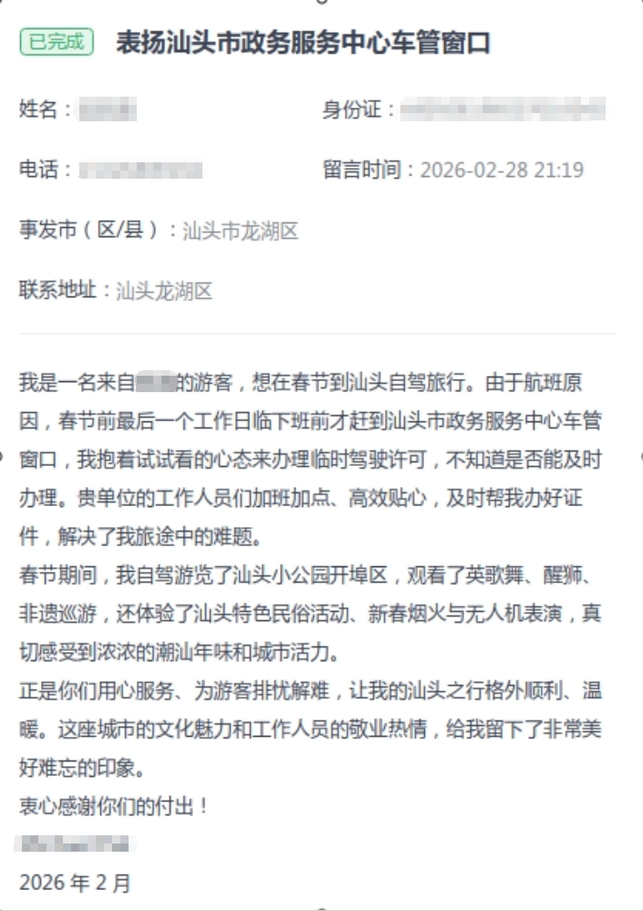 情真意切的留言,不仅是对窗口工作人员高效办事的肯定,更是汕头公安政务服务的一次生动注脚。一张及时办好的临时驾驶许可,为一位远道而来的外国友人顺利开启了一场深度体验潮汕文化的旅程。从公安专厅办证窗口的贴心服务,到小公园开埠区的历史漫步,再到英歌舞、醒狮非遗巡游的沉浸式观赏,以及新春焰火与无人机表演下的欢腾——朴先生的亲身经历,正是汕头以开放姿态迎接八方来客、以暖心服务优化营商环境的一个缩影。