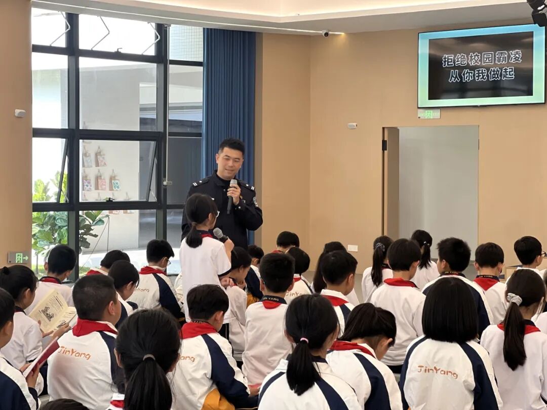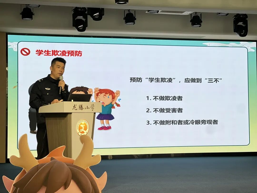活动中,龙腾派出所林文杰警官以“拒绝学生欺凌 争做守法少年”为主题,为在场师生带来一堂贴近生活、通俗易懂的法治教育课。授课过程中,林警官结合小学生年龄特点与认知规律,用生动直白的语言,细致解读《中华人民共和国未成年人保护法》、《中华人民共和国预防未成年人犯罪法》核心内容,明确告知同学们“年龄不是违法犯罪的挡箭牌”,引导大家树立基本的法治观念与规则意识。