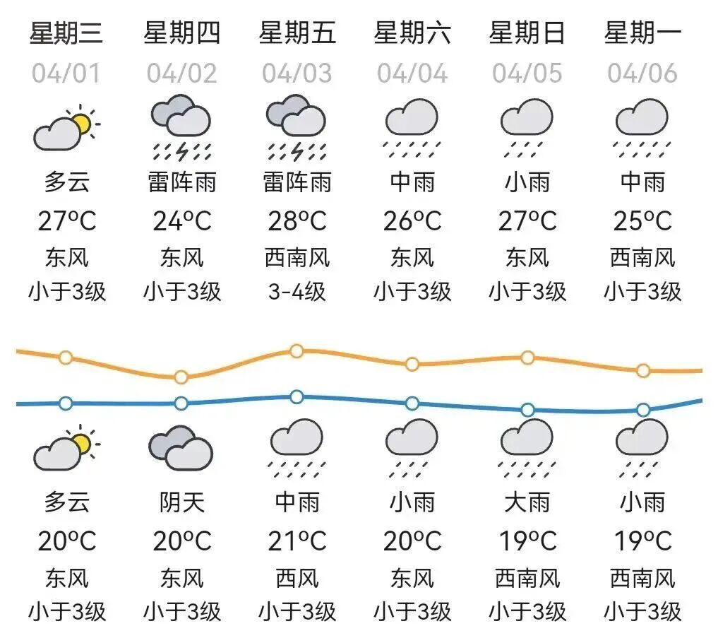 受高空槽和弱冷空气影响,未来三天我市多云间阴天为主,间中有(雷)阵雨,局部雨势较大,局地伴有强对流天气,日平均气温将下降4℃左右,其中4月2日最高气温降至24℃左右,气温起伏变化较大,需注意适时增减衣物。清明祭扫、外出踏青和高空作业需注意防范局地雷电、短时大风等强对流天气及其引发的次生灾害。