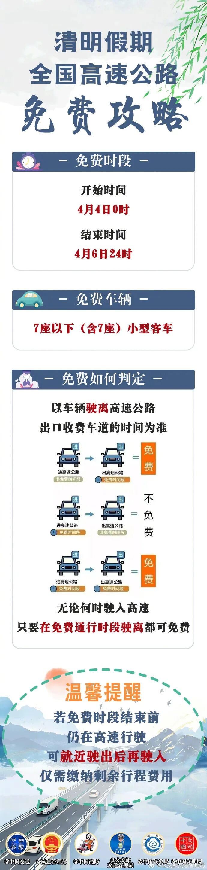 2026年清明节假期,7座以下(含7座)小型客车上高速公路继续免收通行费,免费通行时间为4月4日0时至4月6日24时,共计3天。
