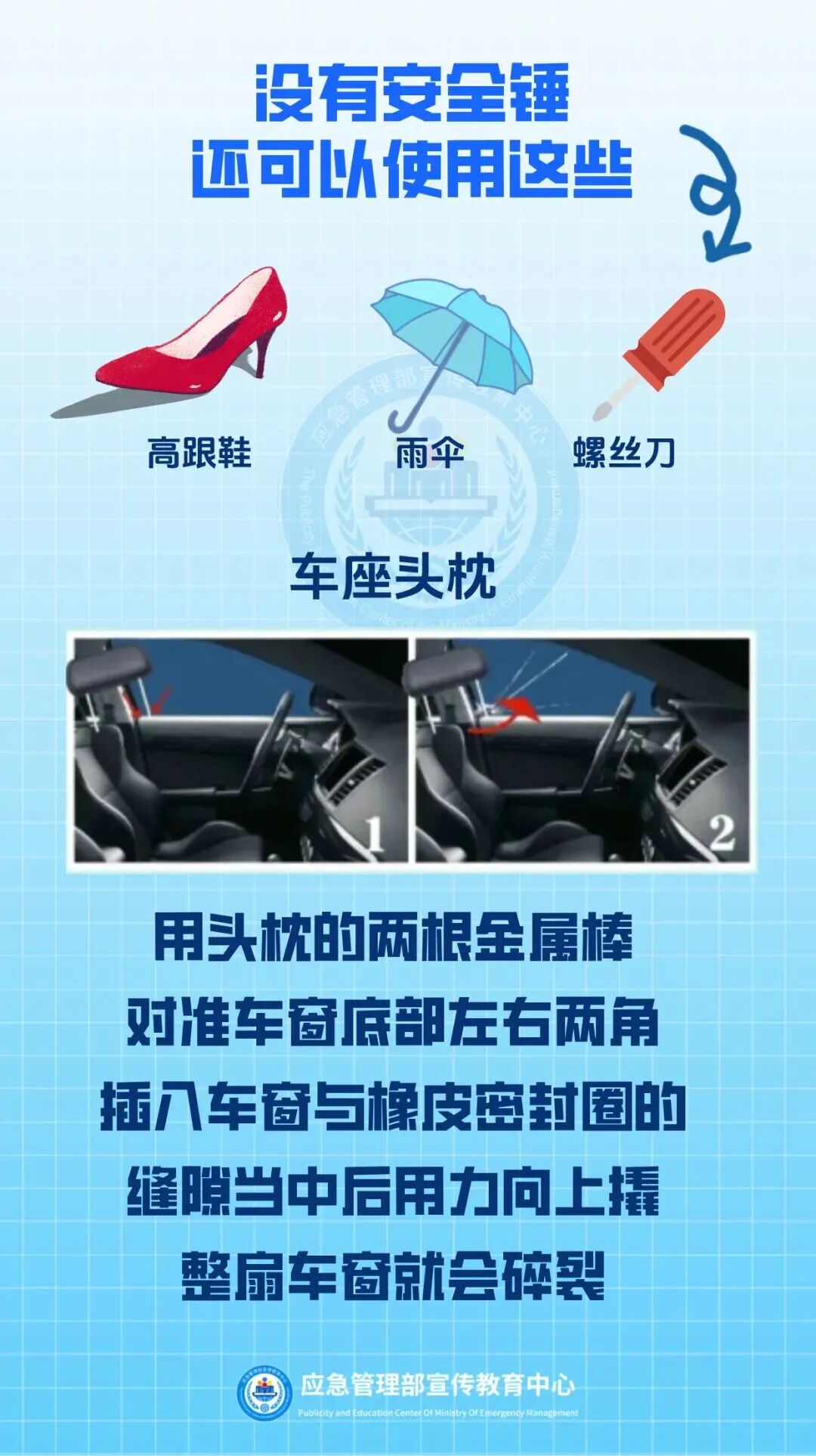 如果无法打开车门和车窗,要利用身边一切可以利用的物品想方设法砸开车窗。
