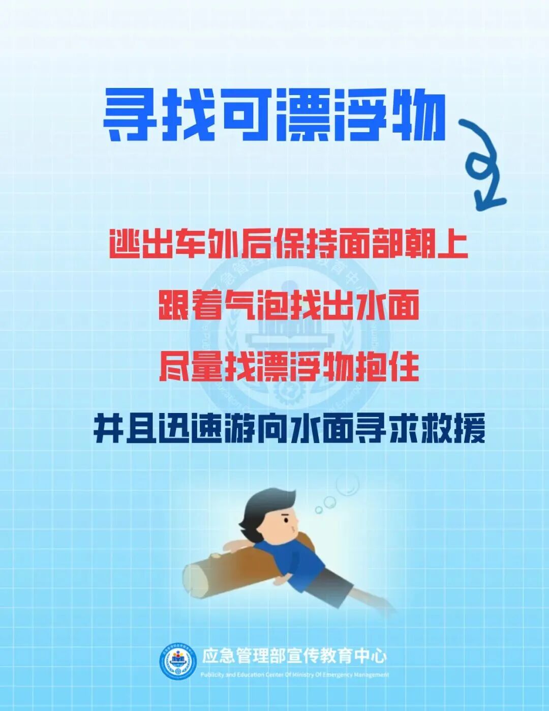 离开车辆后,迅速逃离,跟着气泡上升的方向浮到水面上。