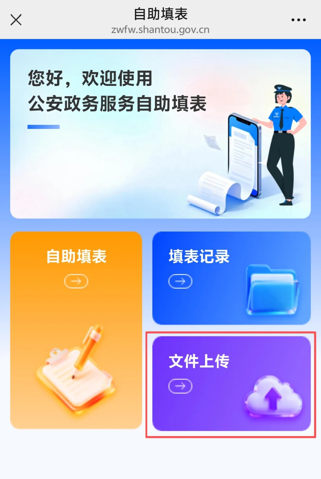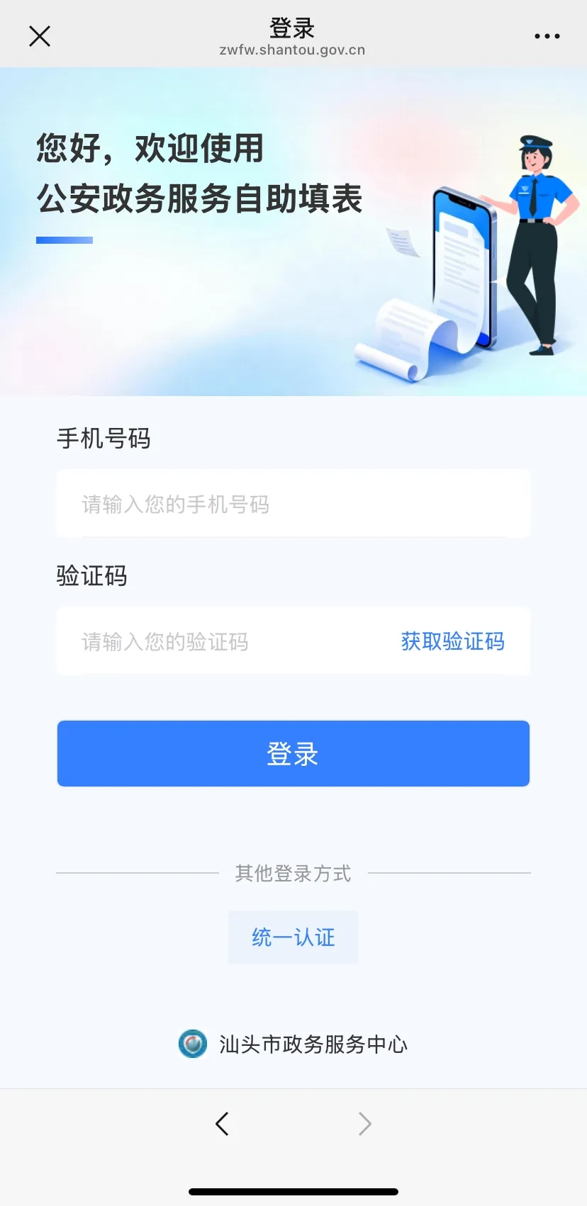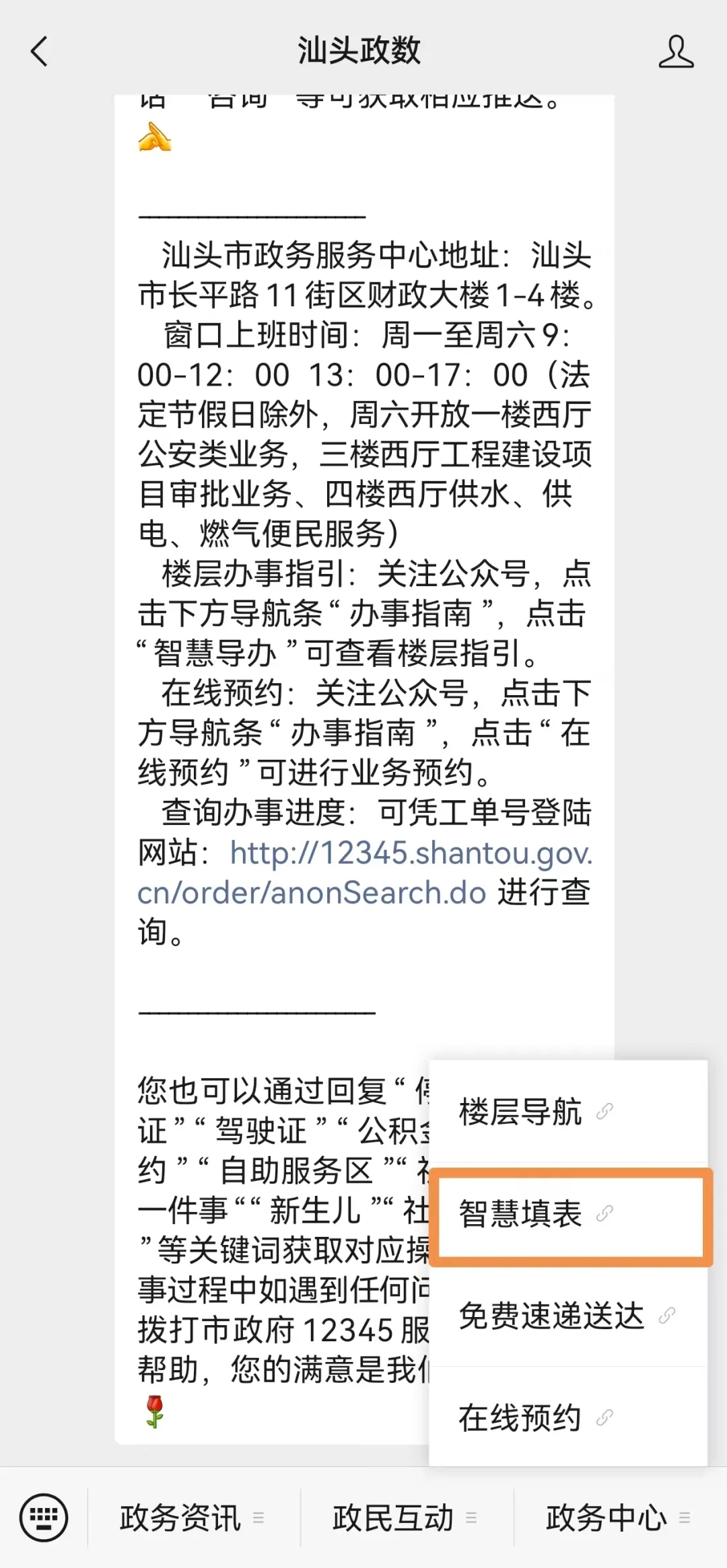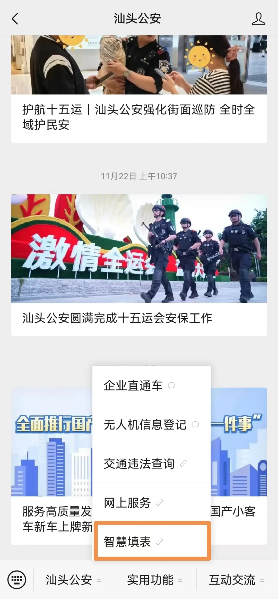 直接扫描系统二维码,或者关注“汕头公安”及“汕头政数”微信公众号,点击主页下方菜单栏“智慧填表”进入填表系统。