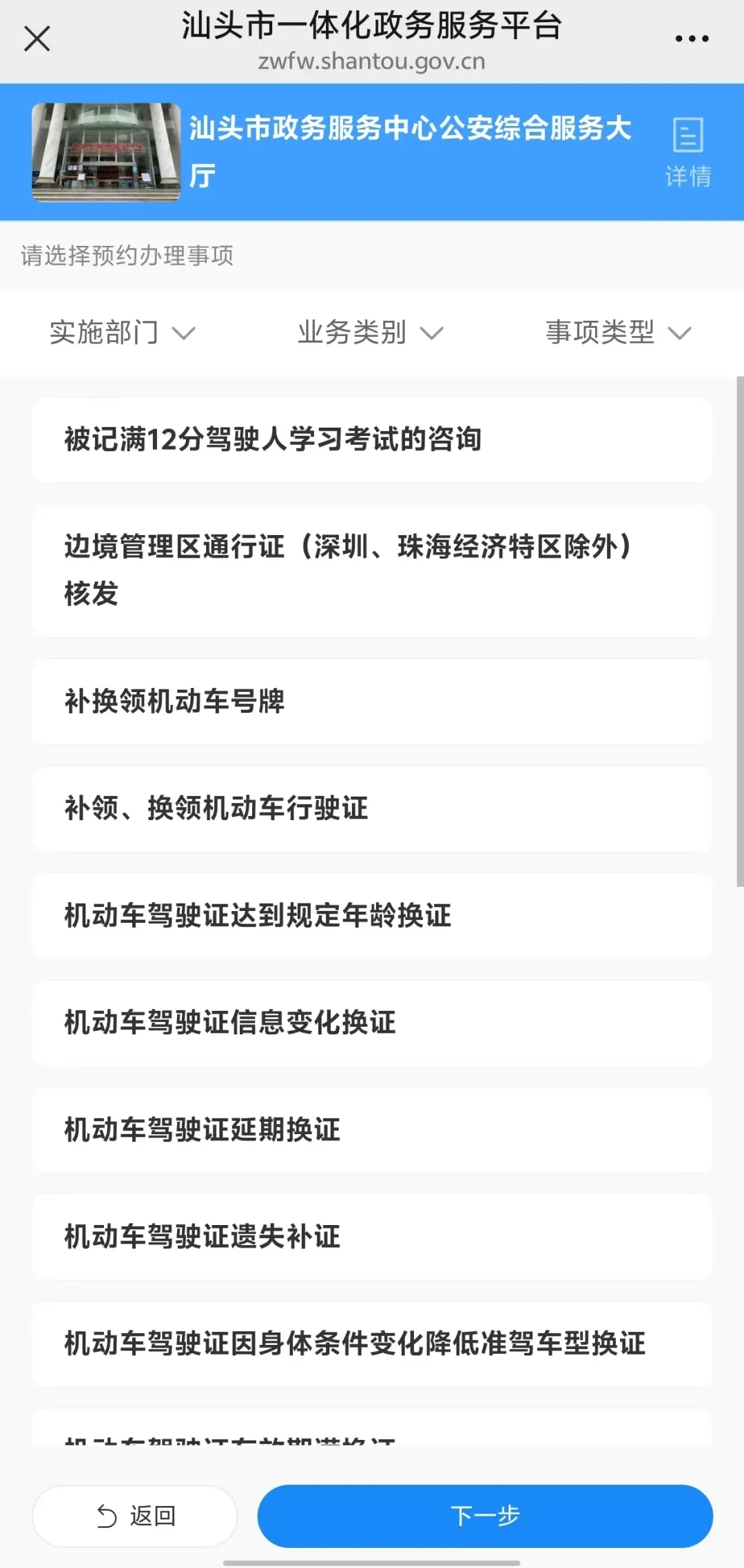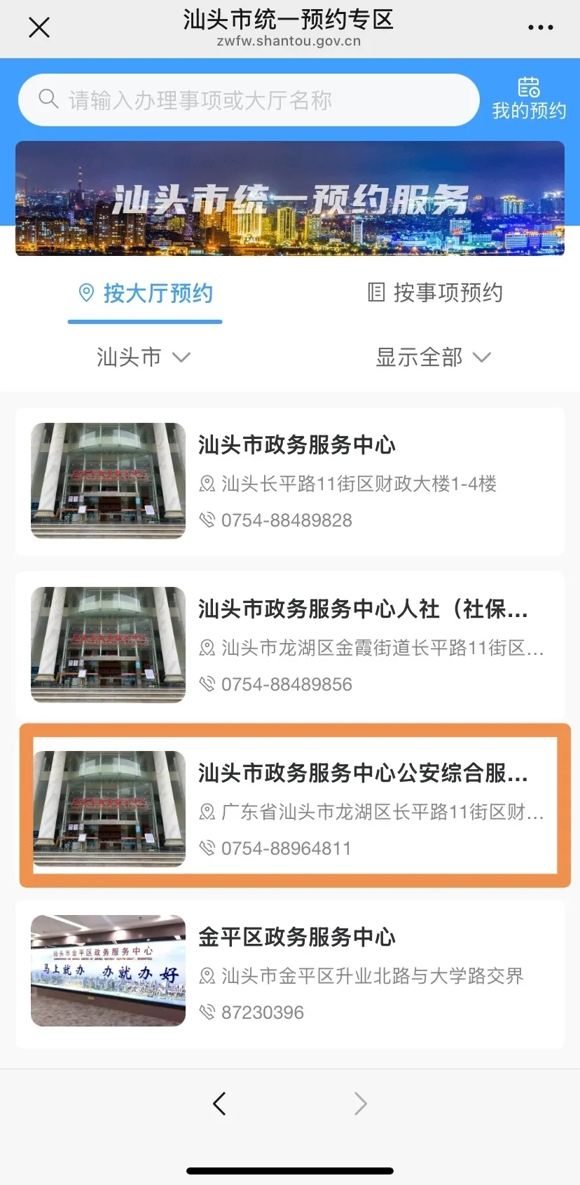 提交表单后,进入预约系统,点击汕头市政务服务中心公安综合服务大厅,选择对应事项及时间进行预约。