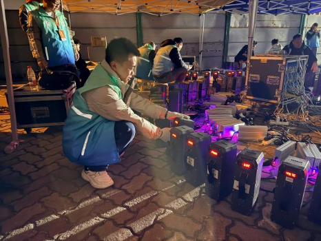 为确保焰火晚会万无一失,资产集团青年志愿者提前数日进驻现场,大家分工明确、协同作战,从设备卸车、分类清点,到精准摆放、逐台充电,再到表演结束后的快速回收、规范入库,每一个环节都严谨细致、有条不紊。面对繁重的保障任务,志愿者们克服连续作业的疲惫,以高度负责的态度,反复核对设备状态、校准摆放位置,确保每一架无人机都以最佳状态参与表演,用幕后坚守为光影秀筑牢安全根基。