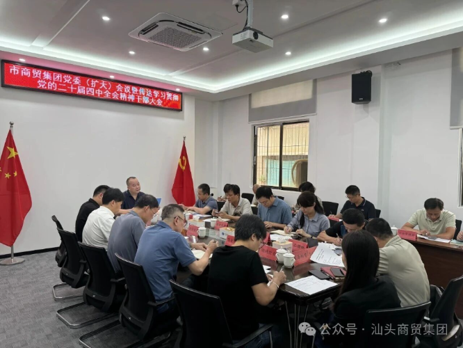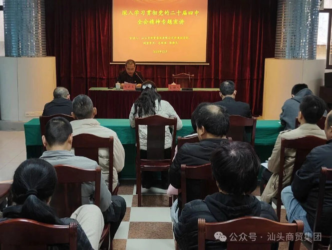 10月30日,集团公司党委召开党委(扩大)会议暨传达学习贯彻党的二十届四中全会精神干部大会,深入学习贯彻习近平总书记在党的二十届四中全会上的重要讲话精神和全会精神,研究部署贯彻落实意见。结合实际制定《汕头市商贸集团有限公司党委学习贯彻党的二十届四中全会精神宣讲工作方案》,成立由集团公司党委主要负责同志任团长,集团公司领导班子成员、各二级企业党组织主要负责同志为成员的集团公司宣讲团,面向集团公司总部和下属企业开展宣讲。