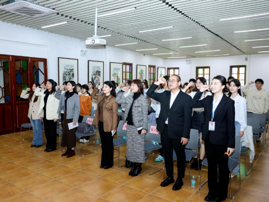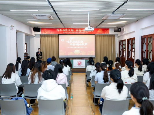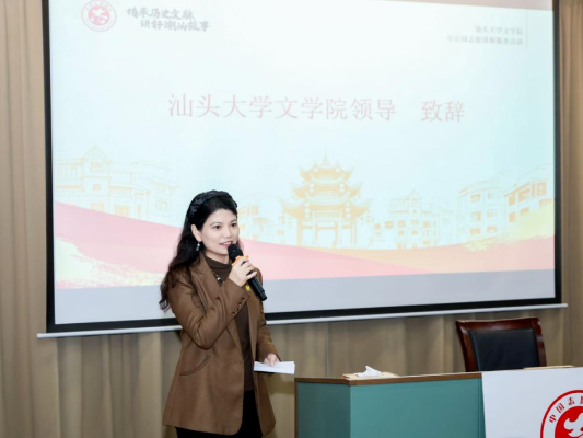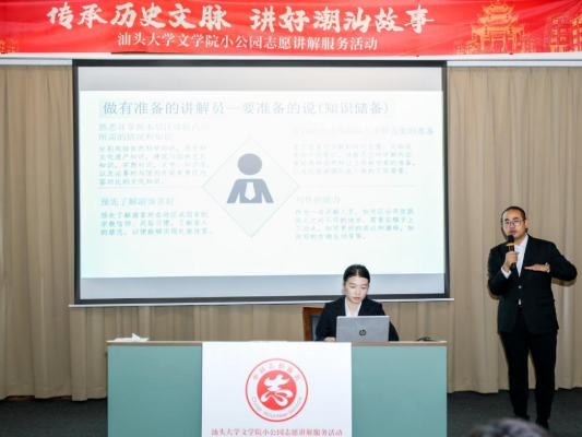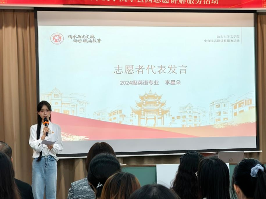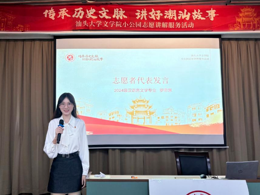 伴随着热烈的掌声,文学院两位志愿者代表围绕报名初衷、对潮汕文化的理解、参与服务的规划分享了她们的初心与期待。其中,2024级汉语言文学专业的罗思慧同学引用《诗经》“周虽旧邦,其命维新”,表达从参观者转变为讲述者的渴望,并直言自己后续会充分利用专业所学,查阅地方文献、民间故事,做一名“有备而来”的讲述者。