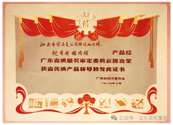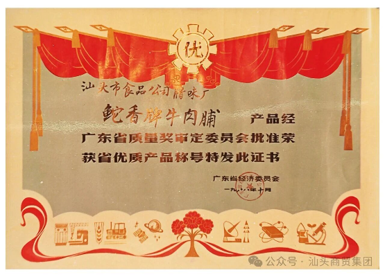 荣誉,是时间对坚守者最公允的注脚。早在1983年,“鮀香”门店便以诚信经营获评汕头市“文明经商先进单位”。随之而来的,是产品品质获得的一次又一次权威认可:1984年,“鮀香”牌猪肉脯荣获广东省经济委员会颁布的“省优质产品”称号;1988年,其牛肉脯再度摘得“省优质产品”称号。这些诞生于改革开放初期的奖项清晰地记录着一个老字号在岁月淘洗中,如何以扎实的工艺与稳定的风味,将自身塑造为潮汕腊味一张醇香的名片。
