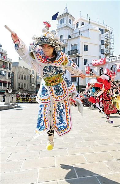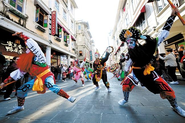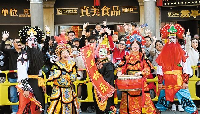 (英歌舞队员和游客一起祝汕头人民新年快乐)
