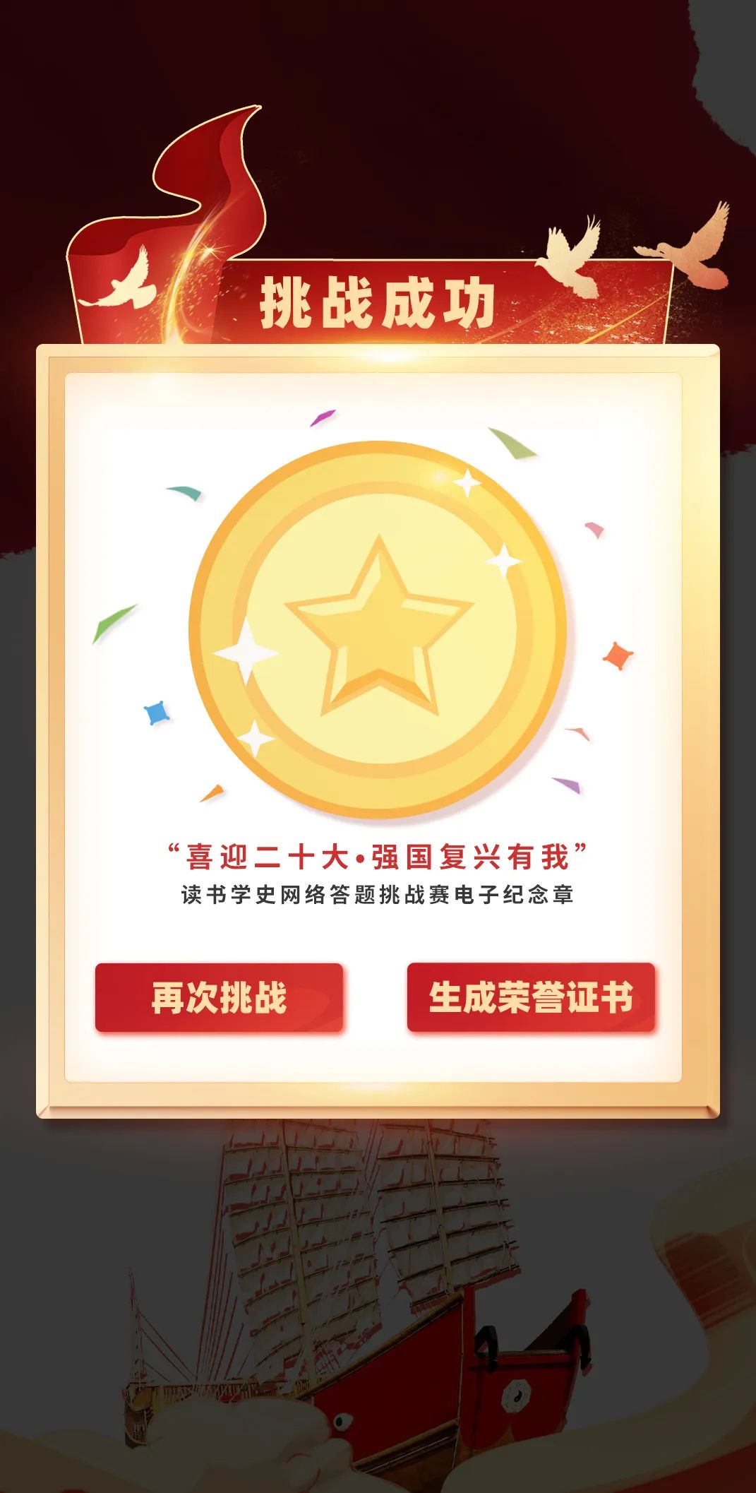 参与者提交成绩可获得电子奖牌纪念;成绩满分者可获得“线上读书学史达人”称号,每个用户拥有一次抽奖机会。