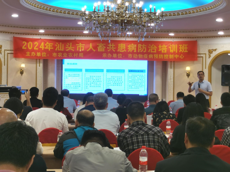 4月28日,市农业农村局在汕头金海湾大酒店举办2024年汕头市人畜共患病防治培训班。市农业农村局分管领导出席培训班并发表动员讲话,认为人畜共患病防治工作需要各级各部门协同防控、群防群控,要求学员们能认识到人畜共患病防治工作的重要性、现实性和紧迫性,借助本次培训提升人畜共患病防治技能,不断适应动物防控新政策、新形势、新政务的要求,争当“人病兽防、关口前移”的践行者和推动者,共筑“绿色防疫”的安全屏障。培训班上,省动物疫病预防控制中心副主任查云峰同志为学员作畜间人兽共患病流行与防控情况介绍;深圳市市场监督管理局二级高级主办邓文煌同志为大家分享《屠宰环节人畜共患病的防控》;广州国家实验室工程师林梦哲先生对当前的一些人畜共患病检测技术也做了介绍。