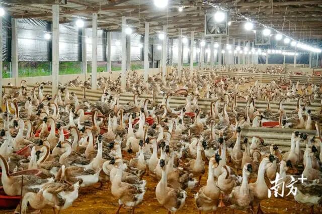 空间布局上,创新形成“两头在内、中间在外”格局:种苗研发和精深加工留在本地,肉鹅养殖则拓展至广东阳江、肇庆,乃至福建、江西、广西等地。更具突破性的是“南鹅北养”——利用东北地区土地广阔、饲料成本低的优势,狮头鹅养殖成功落户黑龙江富锦等地。三年来,北运鹅苗从1万羽增至超11万羽,有效破解了本地养殖用地瓶颈。