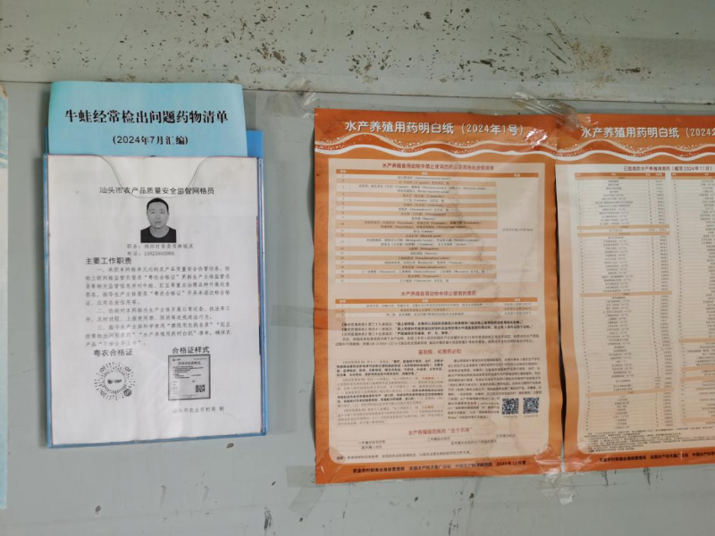 工作专班先后走访多家牛蛙养殖基地,聚焦节日期间集中上市高峰,重点检查饲料、兽药等投入品使用情况,严查是否存在使用水产用药明白纸明确的“禁用药物、假劣兽药、人用药、原料药、未批准用于水产兽药”等五类不可用药物。同时,详细了解出塘前是否严格落实“批批速测”要求,检查生产主体和收购商是否按规定开具或查验承诺达标合格证,推动产地准出与市场准入有效衔接。