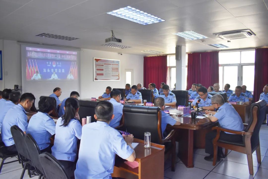 会议以电视电话会议形式召开,局在家领导,局机关、市法援处、汕头公证处全体党员干部在主会场参加会议;市强戒所所领导,副科职以上干部在市强戒所分会场参加会议。