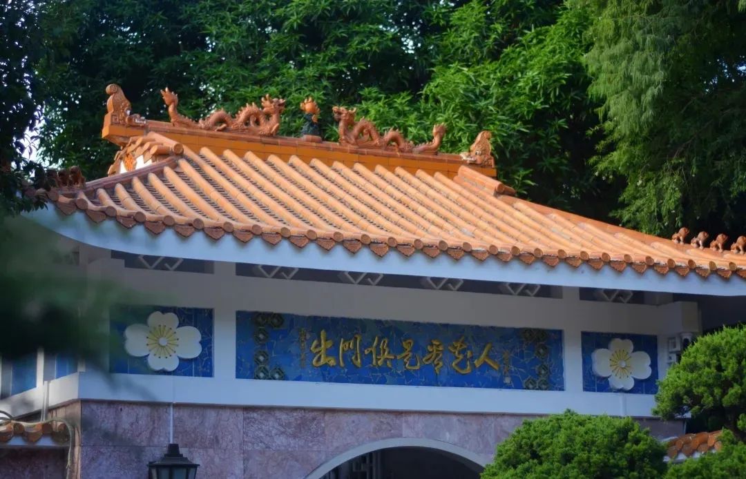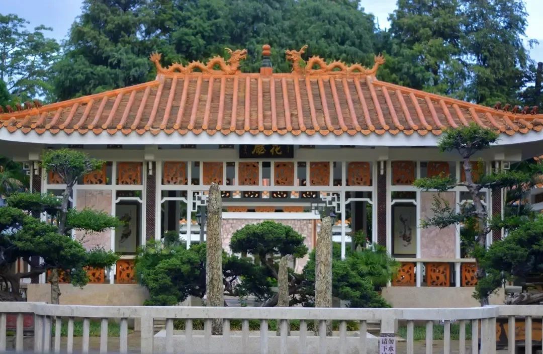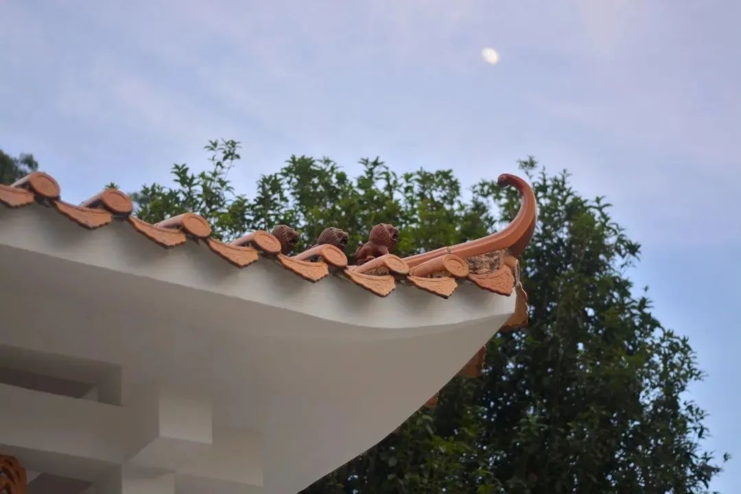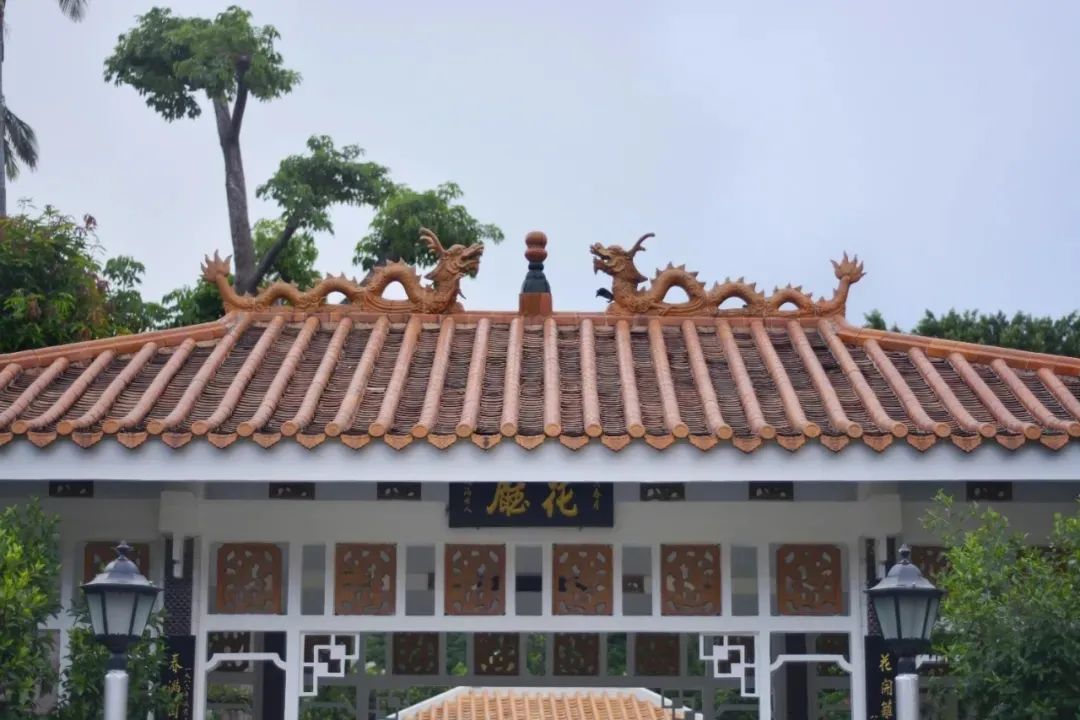 馆花宫的园林建筑在形式上,继承了岭南园林轻盈畅朗,体量较小,装修精美华丽的鲜明特色,但在局部有所创新,如正门门厅、香蝶廊入口亭、花厅三者的屋顶虽均为歇山顶,但垂脊极短,因而没有做垂兽,正脊均为金黄色的硫璃“双龙夺宝”;戗脊的装饰也较独特,打破了有戗兽必有“仙人引路”而不能用龙凤、海牛、天马之类的皇家象征装饰的传统形式。