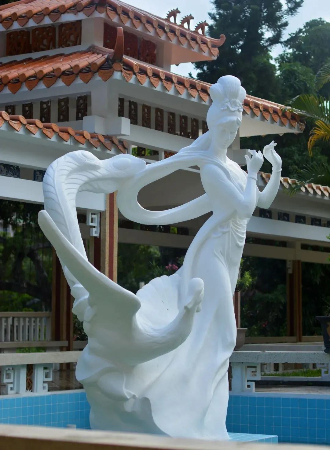 馆花宫在园景营造上运用对景、借景手法。如正门的福建柏花台,正对着香蝶廊的蝴蝶形花坛,以此达到景色互借的艺术效果。
