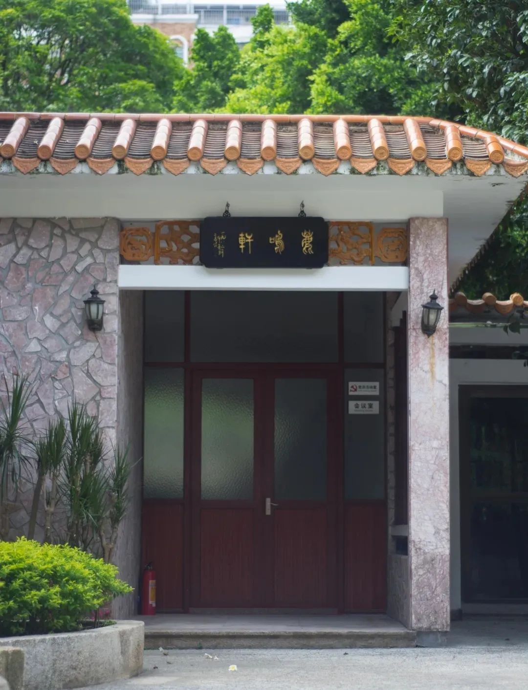 此外,馆花宫多处建筑运用题匾点景。如正门南侧的门眉题有“出门俱是看花人”,朴实易懂的诗句点出了前庭园内外景色互借的意境,却又烘托园中景色和花木之美;接待室的题匾“鹿鸣轩”则来自《诗经·小雅·鹿鸣》中“呦呦鹿鸣,食野之苹。我有嘉宾,鼓瑟吹笙……”,点出了接待室的功能及对来往宾客的嘉许。、