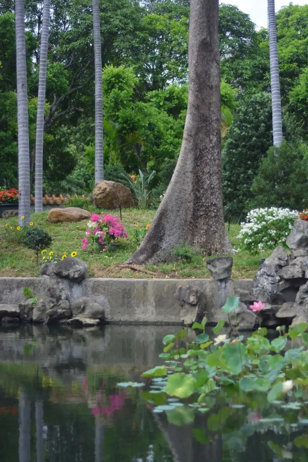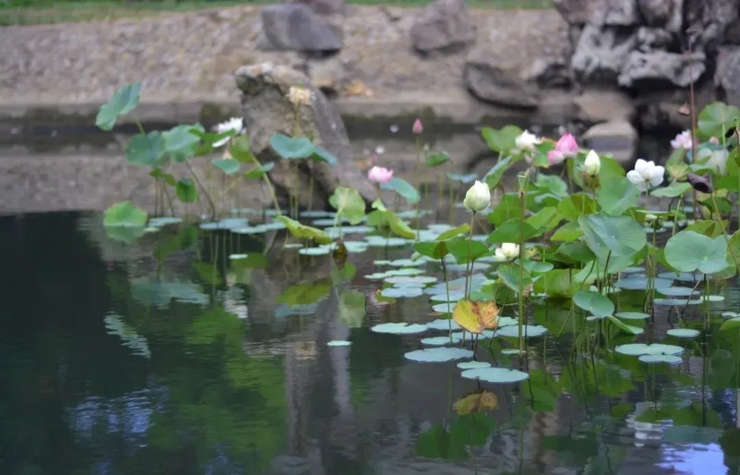 在栽植方式上,前庭主要运用对植,如在香蝶廊入口处对植两株桂花,在花厅入口处对植两株含笑;中庭则用于孤植,如在桥亭旁孤植一株秋枫;在岸边、墙隅、路边、山坡采用丛植、间植,配置湖石、腊石、英石、松皮石等形态优美的石材。可以说,“馆宫处处景胜花”。