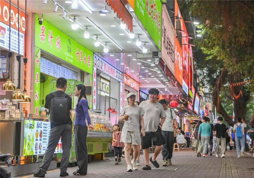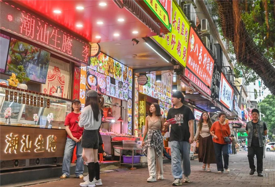 龙眼南路美食街已成为来汕游客的热门打卡点之一。10月29日下午,记者在龙眼南路看到,虽然是工作日上班时段,道路上人群仍然熙熙攘攘。各个美食商铺香飘四溢,吸引着天南海北口音的外地游客驻足品尝。