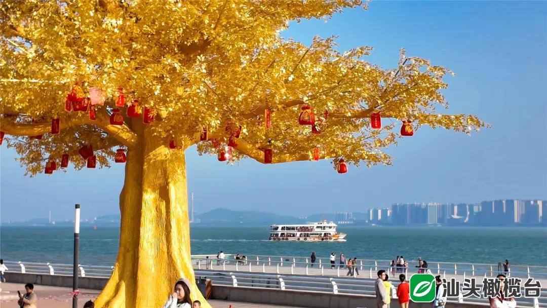 人民广场及周边则藏着双重惊喜:英歌舞人物雕塑栩栩如生,衣袂飞扬、神态昂扬,生动再现“中华战舞”的刚劲豪迈与灵动神韵,静静诉说着潮汕非遗的深厚底蕴;原七天码头矗立的黄金树熠熠生辉,枝头缀满红彤彤的灯笼、寓意吉祥的福袋,白天金光闪闪、尽显大气,夜幕降临后灯光流转、璀璨夺目,点亮整座城市的新春夜色。