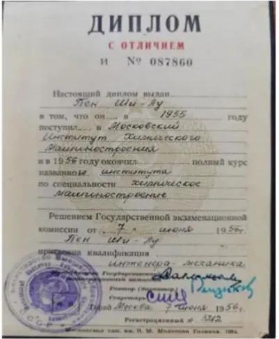1956年,鉴于彭士禄课程成绩与毕业论文取得全优,毕业时获得了莫斯科化工机械学院颁发的“优秀化工机械工程师”证书。