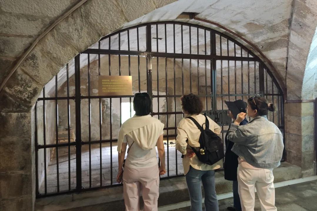 游客驻足于监狱复原场景前。