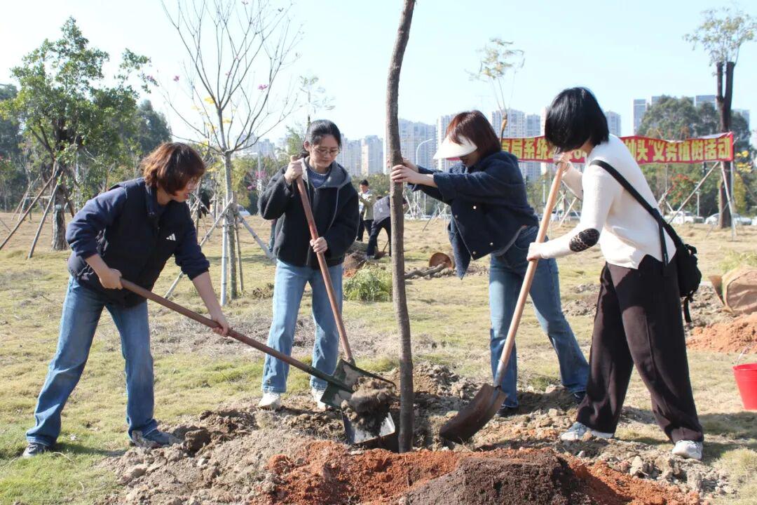 活动现场,在局领导的带领下,干部职工们分工协作、干劲十足,纷纷撸起袖子、挽起裤腿,挥锹培土、提水浇灌,以“绣花功夫”精心栽种每一株苗木。经一系列有序劳作,69株凤凰木、24株马拉巴栗等苗木悉数落地定植,在绿地勾勒出错落有致的“绿美”风景线。近年来,通过义务植树节活动,该区域绿地绿量持续增加,绿化景观效果得到显著提升。
