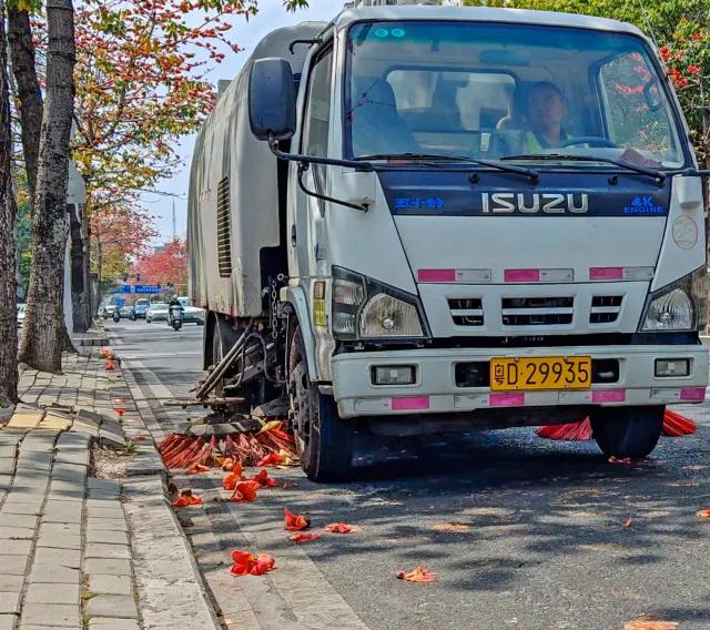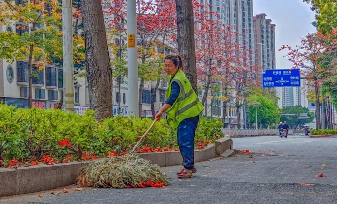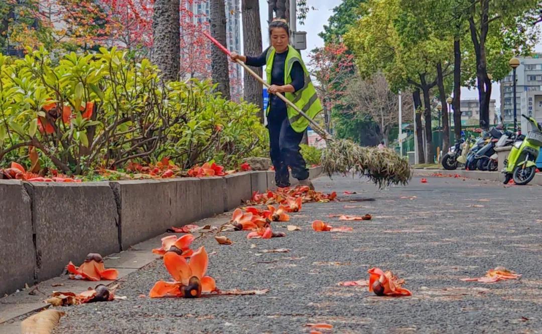 木棉花的花期虽美,却有着“任性”的飘落节奏。正值盛花期,枝头的花朵不断绽放、飘落。为了不让花瓣堆积影响市容和通行,环卫工人只能不间断地巡回清扫,从清晨到日暮,弯腰、清扫、清运,一系列动作重复了一遍又一遍,汗水浸湿了他们的工作服。然而,相较于普通落叶,木棉花的清理有着独特的难题。
